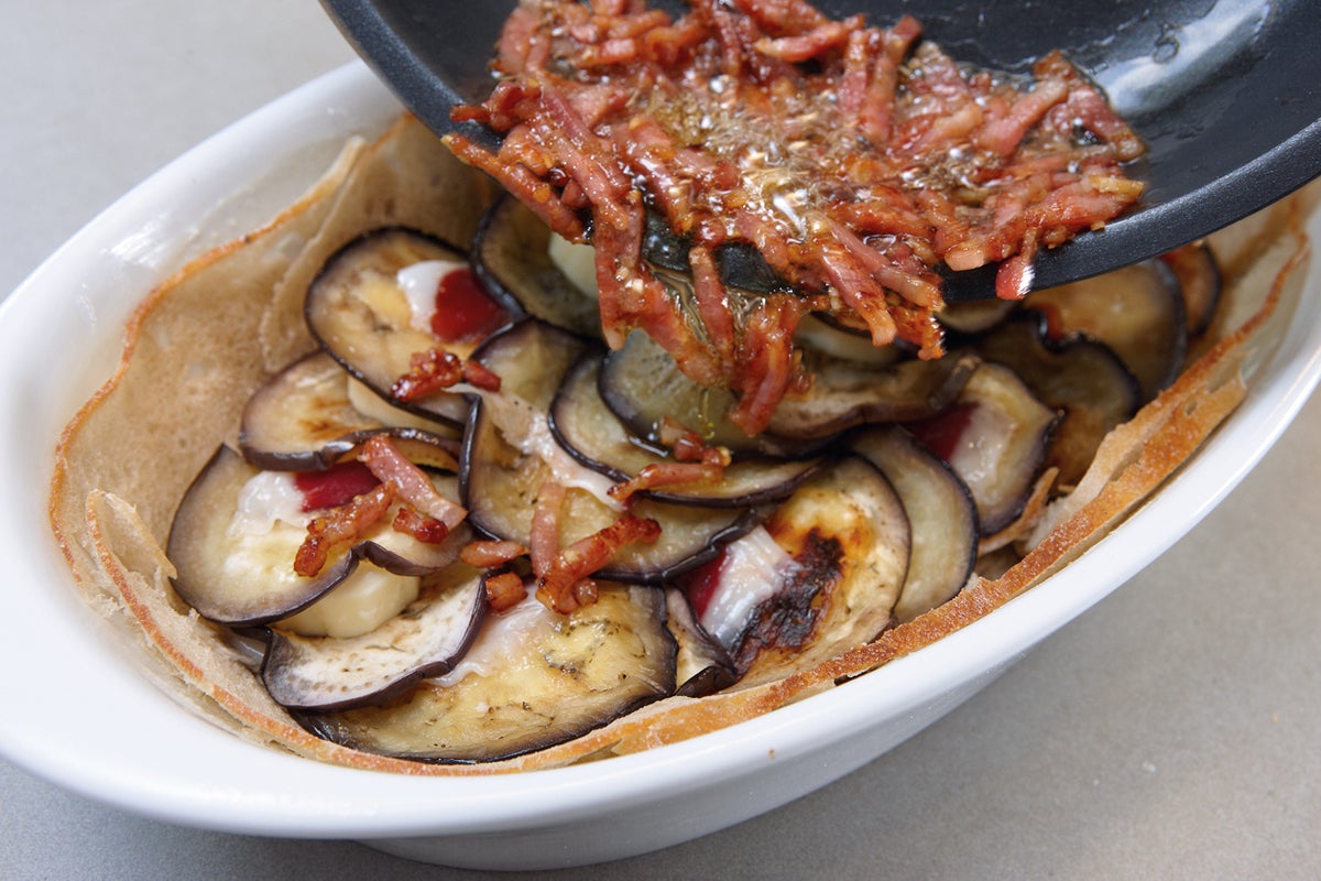 3. Se prepara un sofrito con el ajo y la panceta en el mismo aceite y se vuelca sobre las berenjenas. Se corta el pan en láminas muy finas.Se pinta con mantequilla el molde, para que no se nos pegue, y se van colocando las láminas de pan con sumo cuidado, cubriendo el fondo y las paredes para hacerle una base al pastel. Se ponen, alternando, los 250 gramos de queso con las berenjenas, los lardones de panceta y el jamón de pato.