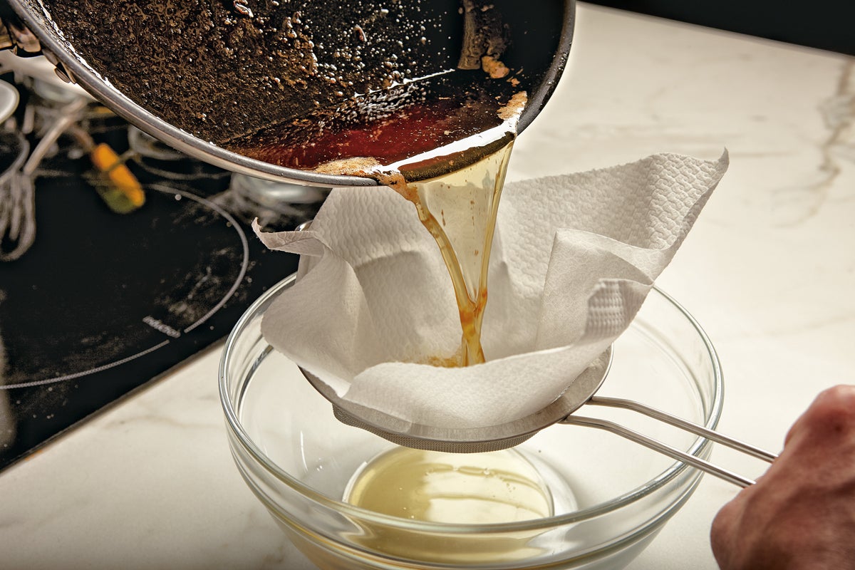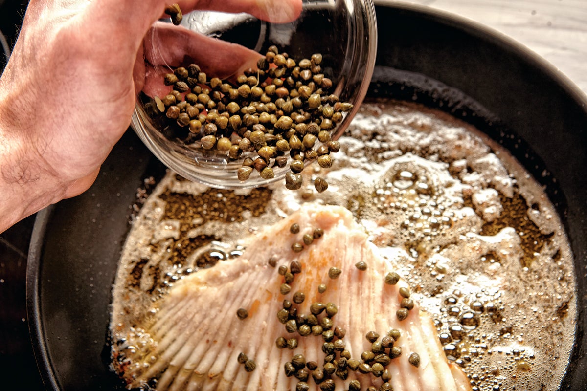 4. Se agrega el zumo de limón y se pasa la mezcla por un fino con papel, con el fin de eliminar impurezas. Se incorporan entonces las alcaparras y el perejil y se rocía la salsa sobre el pescado.