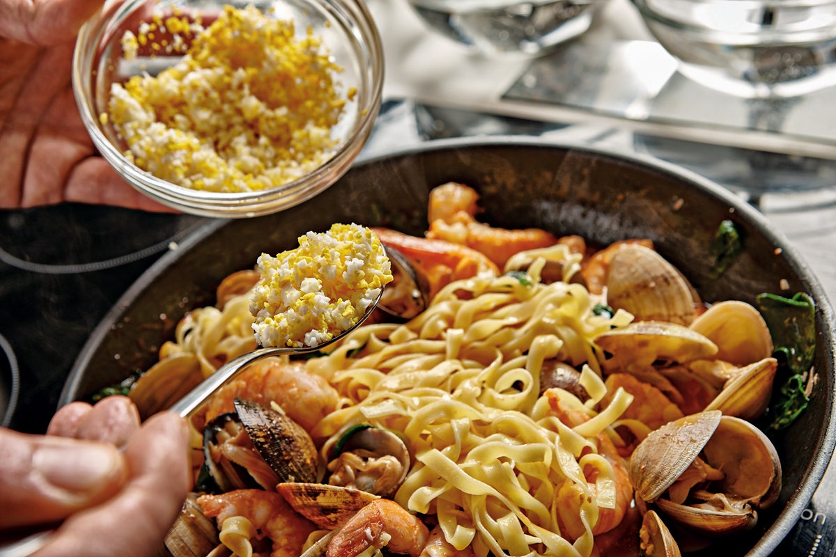 2. Hacemos después lo mismo con las almejas y salpimentamos. Posteriormente, en la misma sartén, salteamos también las espinacas y el tomate. Cuando la pasta esté ya cocida, mezclamos todos los ingredientes y, si así lo deseamos, estiramos un poco la salsa con el agua de cocción de la propia pasta.Acabado y presentación.