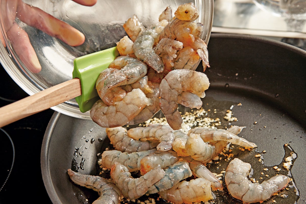 Para empezar con la receta de espaguetis marineros, se saltean las gambas ya peladas en la misma sartén en la que antes sofreímos el ajo.
