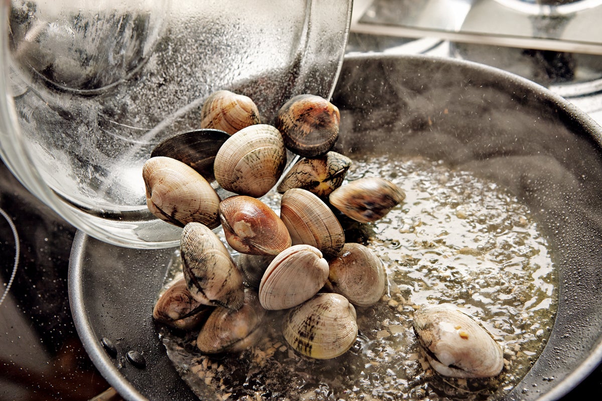 Se echan las almejas una vez retiradas las gambas, se salpimientan y se saltean también.