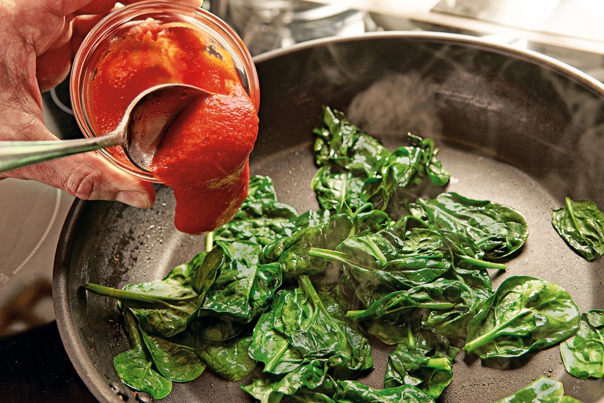 Se añaden las espinacas y el tomate tras retirar las almejas y se saltean en la misma sartén.