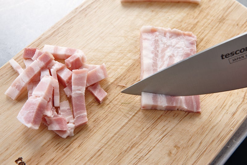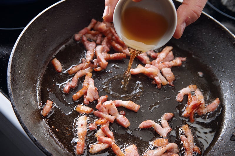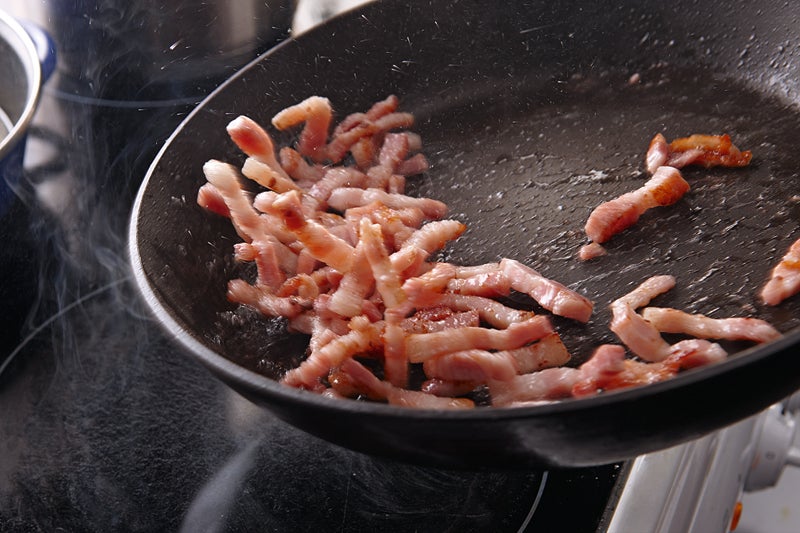 Se fríe el beicon en lardones en una sartén a fuego fuerte, sin nada de grasa hasta que se tueste.