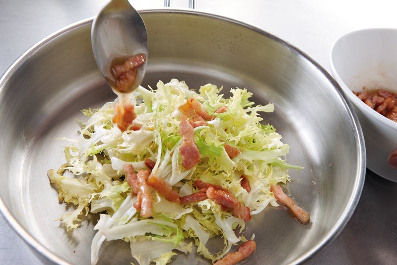 3. Se unta el bol en el que aliñaremos la escarola con el ajo. Se saltean los lardones de beicon en una sartén a fuego fuerte, sin nada de grasa, hasta que se tuesten. Se añade el vinagre, se sacan y se dejan entibiar. Se echa una pizca de sal y de pimienta sobre ellos, un pellizco de las cortezas de naranja en almíbar, escurridas, y el aceite y se revuelve.