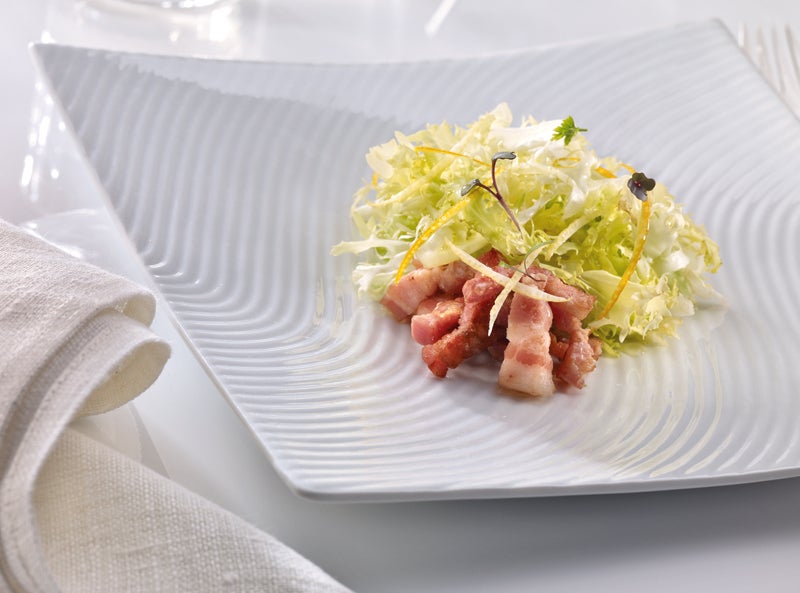 Se incorpora el vinagre de sidra, se sacan los lardones de beicon y se dejan entibiar.