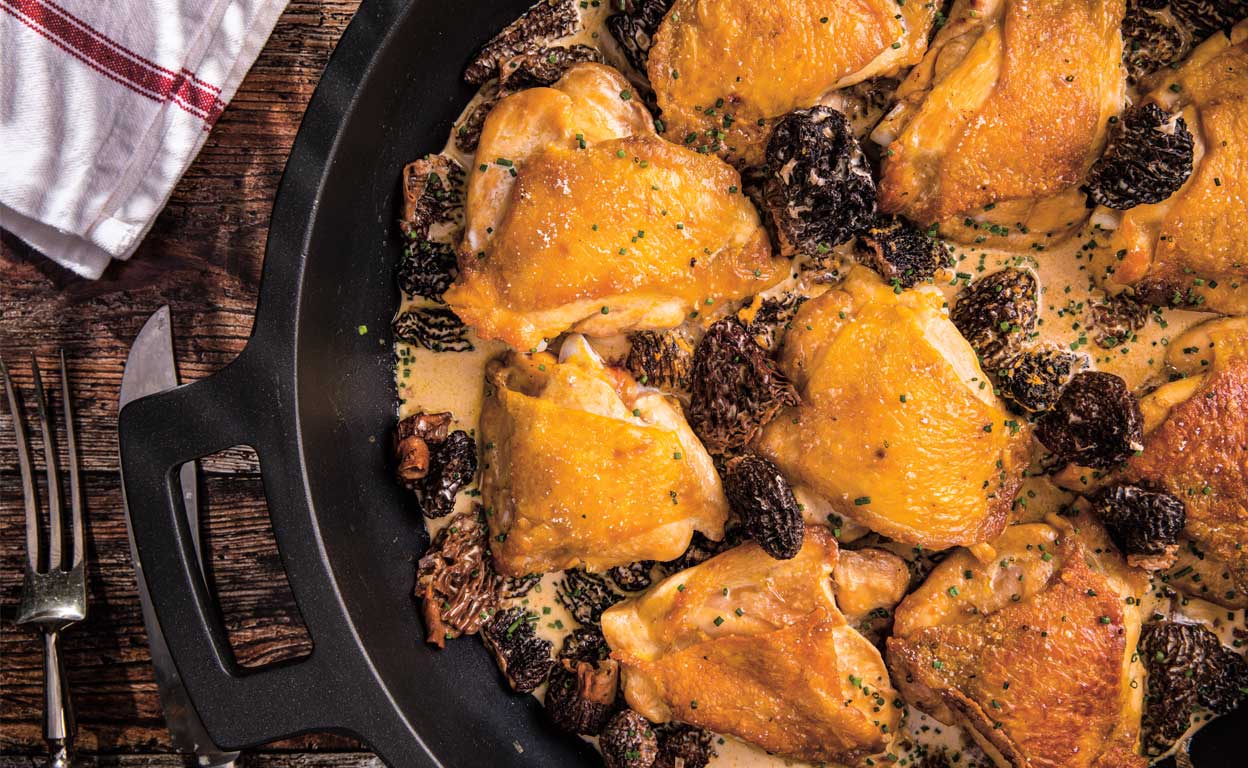 Si empleas colmenillas secas, rehidrátalas en agua y emplea el caldo de remojo reducido al fuego para que se concentre el sabor al hacer la salsa. A la vez puedes deshuesar los contramuslos y estofarlos limpios, aunque resultarán menos jugosos.