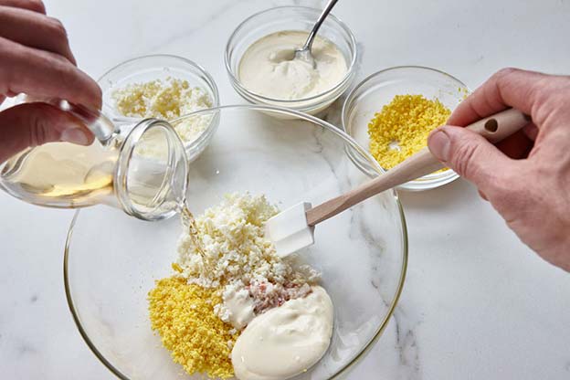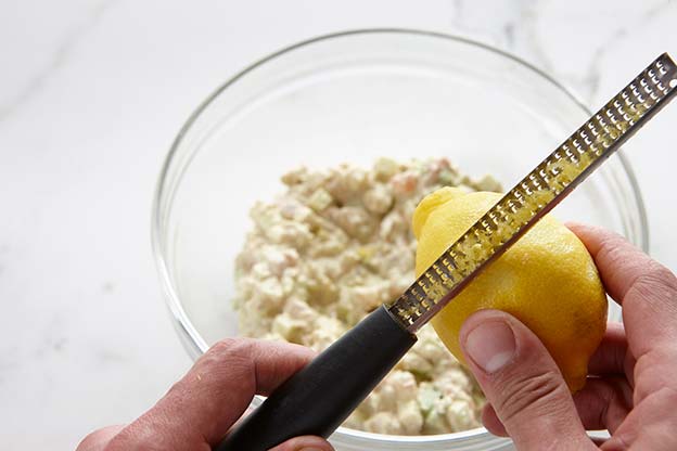 Se añaden al bol la ralladura y el zumo de limón, las gambas, la manzana, el puerro, la salsa mahonesa, el yogur, el curry, la mostaza y se salpimienta generosamente. Se enfría la mezcla un buen rato bien cubierta en la nevera.
