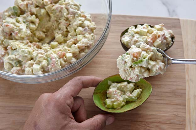 Con una cuchara se vacía la pulpa de cada medio aguacate sobre un bol, deshecha en dados. Se guardan las cáscaras de los aguacates, que nos servirán como recipientes para servir la ensalada.
