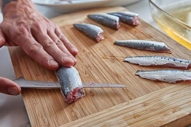 Si no encontramos sardinas, podemos hacer la receta con boquerones o con lomos pequeños de salmonetitos. Se lavan las sardinas y se eliminan las escamas con un cuchillo. Se desloman y se dejan en filetes, quitando la espina central.