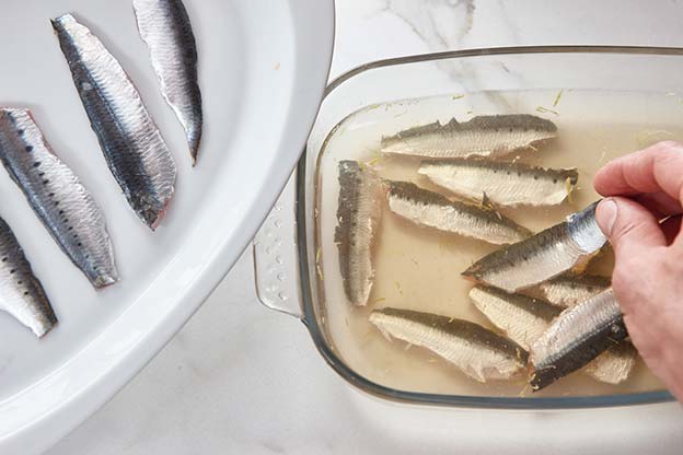 Se mezcla el agua con el vinagre, el zumo y la cáscara rallada y se introducen las sardinas en la nevera, manteniéndolas frías una hora. Se sacan entonces, se secan con papel de cocina y se reservan en una fuente. Deben quedar un poco curadas: semicrudas y con el corazón rosado.