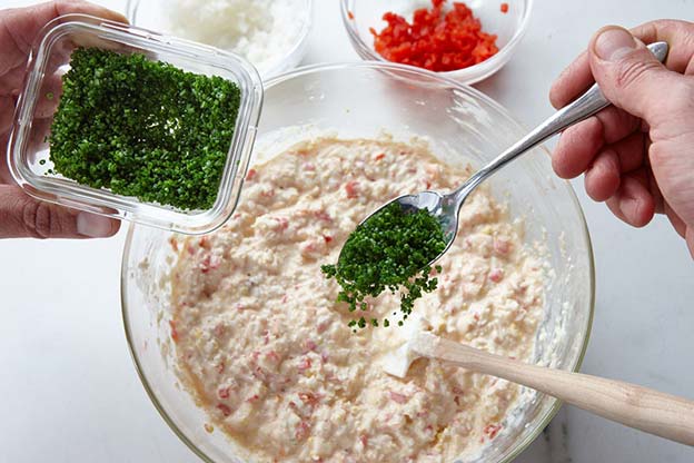 Se echan el pimiento, la cebolleta, los langostinos y el cangrejo y se remueve