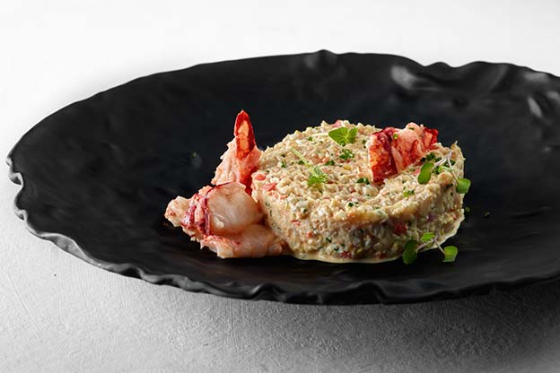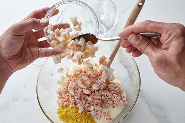 Sobre la tabla se trincha el bogavante y se guardan los pedazos más nobles. Se añaden las puntas picadas de bogavante al salpicón, además del c