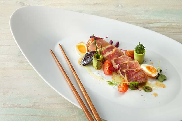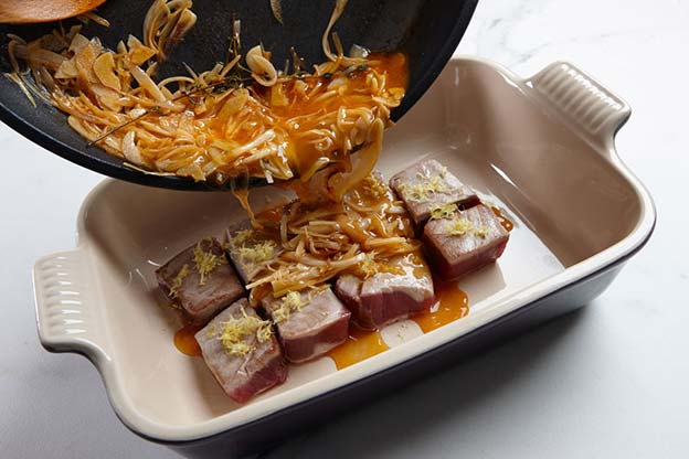 Con un cuchillo afilado se corta en dados anchos el atún. Se salpimientan. En una sartén antiadherente se doran ligeramente sin que se nos cocinen. Se escurren a una fuente en la que entren bien justos y apretados. Se ralla por encima el limón, se parte en dos y se exprime sobre el pescado.