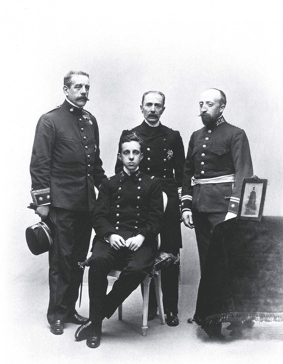 Alfonso XIII, con 14 años, junto con sus profesores. El joven rey asumiría el poder dos años después, en 1902, al alcanzar la mayoría de edad. El retrato es de Christian Franzen, un danés convertido en el preferido de la Familia Real y colaborador de la revista Blanco y Negro.