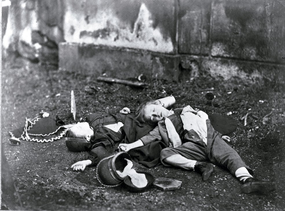 La desesperación francesa en 1871, en la Guerra Franco-Prusiana, llevó a la aparición de las Compositions. Montajes como éste, titulado Niños muertos por una granada en Mont Rouge, buscaban demonizar al enemigo. Meses después, Francia era derrotada en la batalla de Sedán.