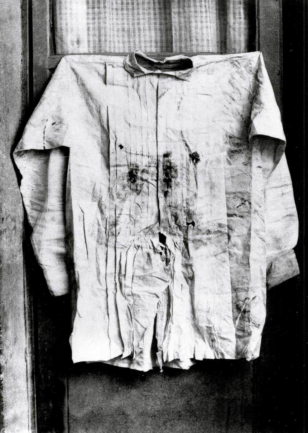 La camisa de Maximiliano I, fusilado el 19 de junio de 1867. Son perceptibles los impactos en abanico, prueba de una descarga agrupada. François Aubert, autor de la imagen, fue el fotógrafo favorito del archiduque austriaco llevado por Napoleón III al trono de México.