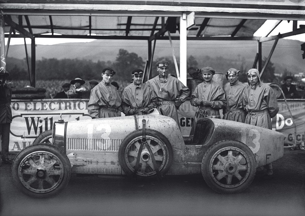 El equipo Bugatti en el Circuito de Lasarte, en San Sebastián, en 1924. Las marcas ya competían entre sí, uniformaban a sus equipos y promocionaban sus coches, cada año mejores. Ya había boxes, patrocinios y glamour...