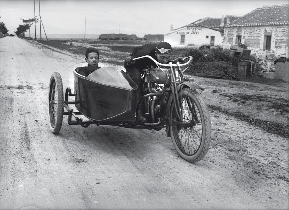 Una carrera de motos en el Circuito de Galapagar, en Madrid, en 1917. El piloto, con cara de velocidad, se pega como los jinetes al caballo para ganar valiosísimas décimas. La pasión y la competitividad eran las mismas que hoy.