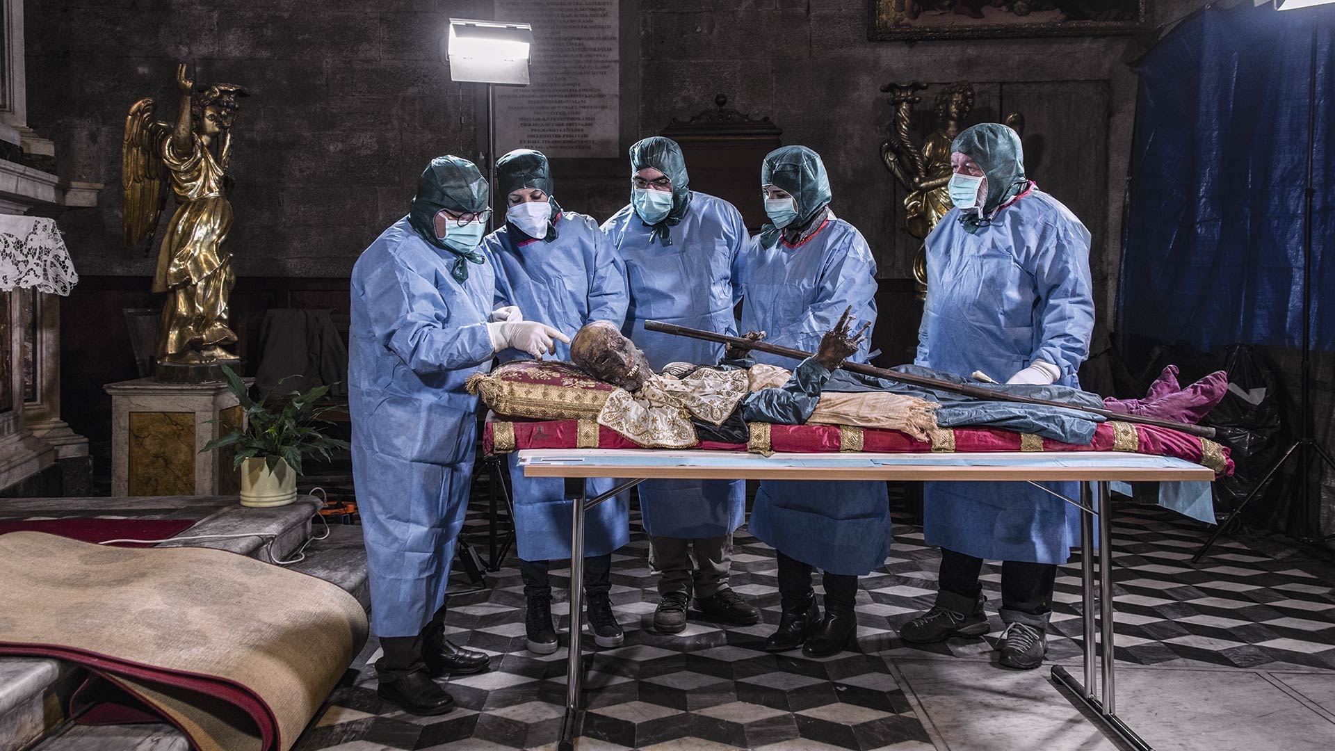 El paleontólogo Gino Fornaciari y su equipo examinan la momia de San Davino, que se conserva bajo el altar de la iglesia de San Miguel en Foro (Lucca). Davino fue un peregrino armenio del siglo XI que murió en Italia cuando se dirigía a Santiago de Compostela. Ahora interesa por una cuestión de medicina histórica: presenta una herida en el cráneo que fue cauterizada según el método difundido por el médico cordobés Abulcasis. Es el primer caso documentado de uso medieval de la cauterización para detener hemorragias.