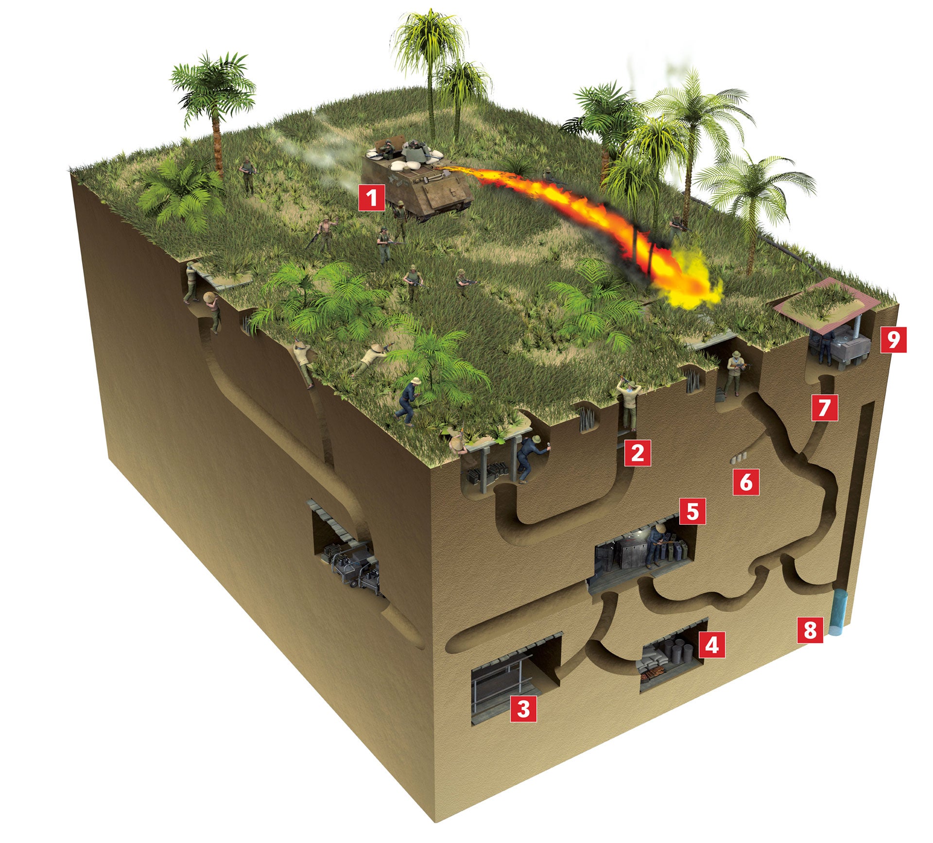 El Ejército estadounidense se encontró con muchas dificultades a la hora de desalojar al enemigo oculto bajo tierra. Las entradas a las galerías solían estar muy bien camufladas y, si los accesos llegaban a ser descubiertos, el intento de destruirlas por medio de explosivos o de lanzallamas no solía ser suficiente.