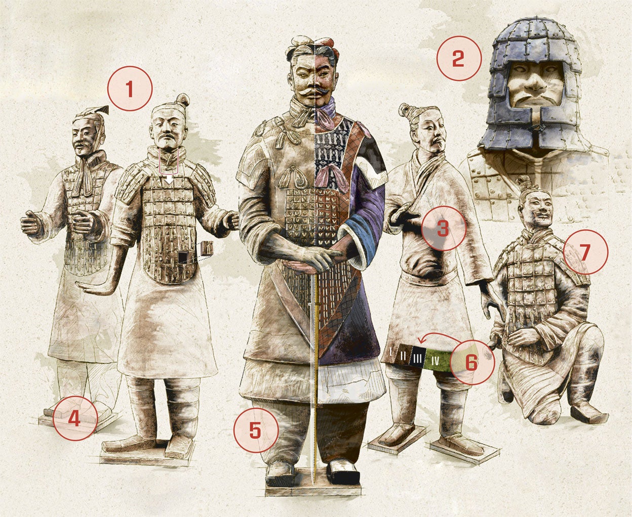 5. Originales: Las figuras fueron pintadas en colores brillantes creados a partir de materiales molidos como azurita, cinabrio, carbón vegetal u óxido de hierro. Las armaduras de los oficiales de alto rango están forradas con exquisitos patrones geométricos.