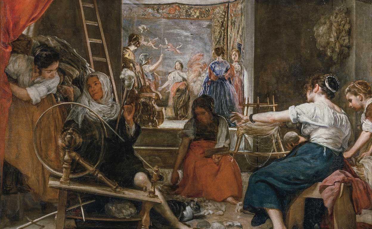 Obra tardía de Velázquez (1655-1660) también conocida como La fábula de Aracne, se presenta en tres planos. En el primero, cinco mujeres están trabajando: la que parece anciana sería la diosa Atenea disfrazada (le delatan las piernas jóvenes); en un segundo plano, más elevado, tres mujeres observan una escena en la que Atenea reprende a la tejedora Aracne; el tapiz, ‘El rapto de Europa’, de Rubens, del que se ven los ángeles, es el tercer plano.