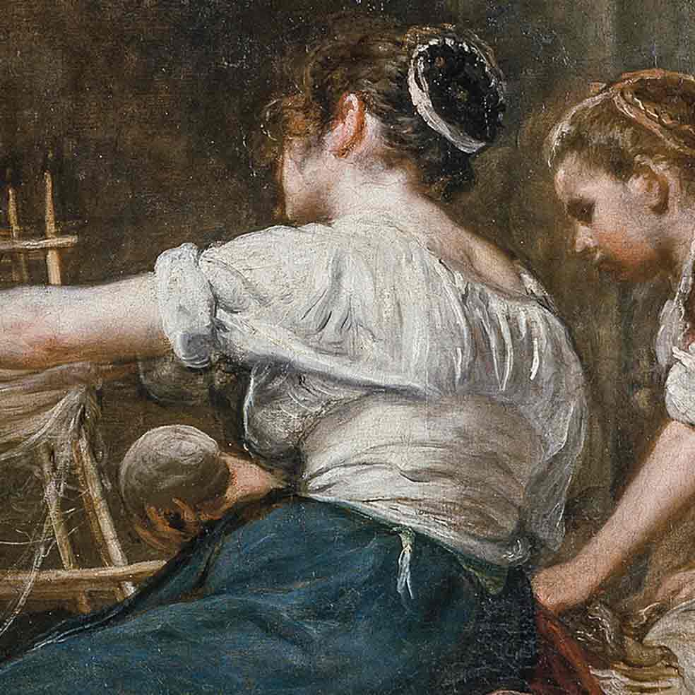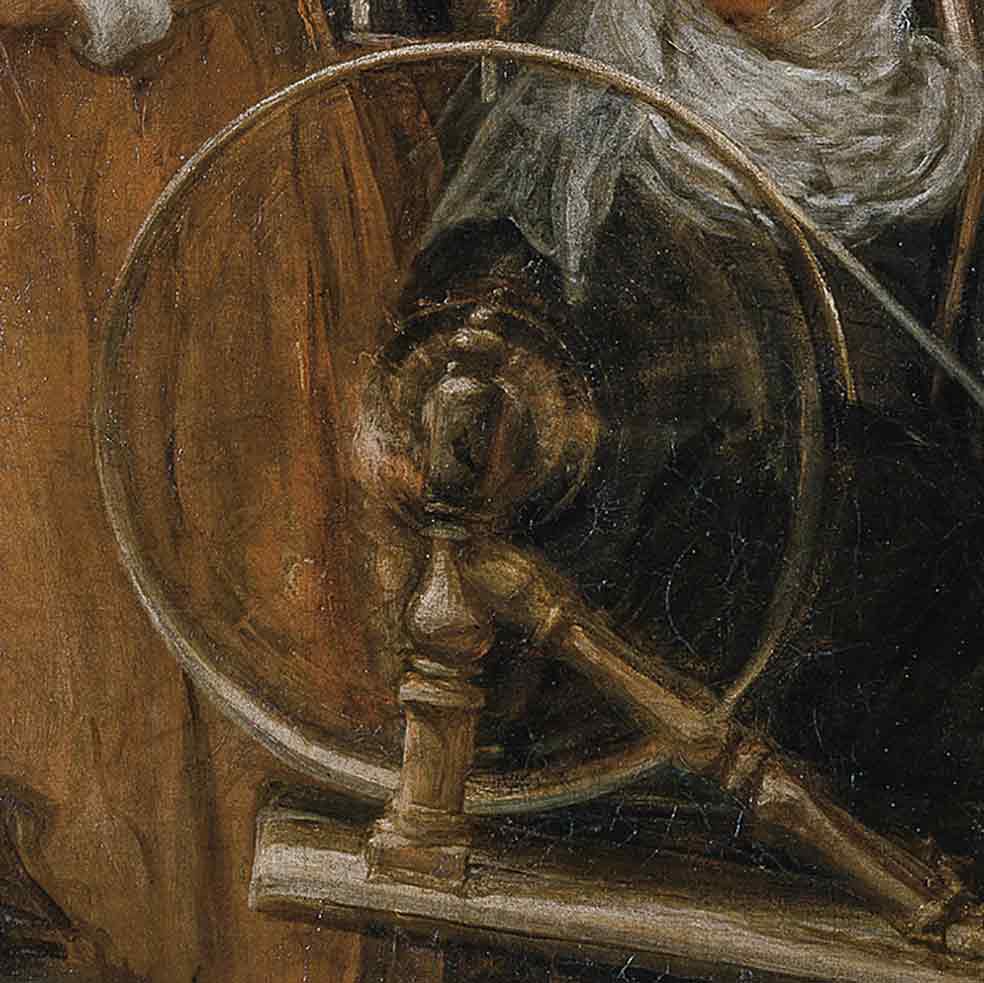El Museo del Prado destaca que «la imitación del movimiento está perfectamente lograda en la rueca». Velázquez lo consigue difuminando los contornos y el color. El resto de la escena también se mueve: los personajes conversan, trabajan y gesticulan. Se muestra una actividad artesanal en plena producción. También hay acción en la escena del fondo, con Atenea (esta vez representada con casco) reprendiendo a Aracne.