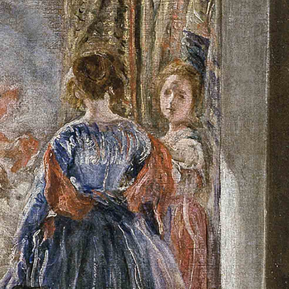 Los personajes están inmersos en sus asuntos y labores, de espaldas o mirando a su interlocutor. Hay un único personaje que mira de frente. Se trata de la joven en el plano elevado que gira la cabeza como si atendiera a una llamada proveniente de fuera del lienzo. Los expertos enlazan la actitud de encararse con el espectador de este personaje con otras obras en las que Velázquez se retrata a sí mismo en una actitud similar, mirando al espectador.