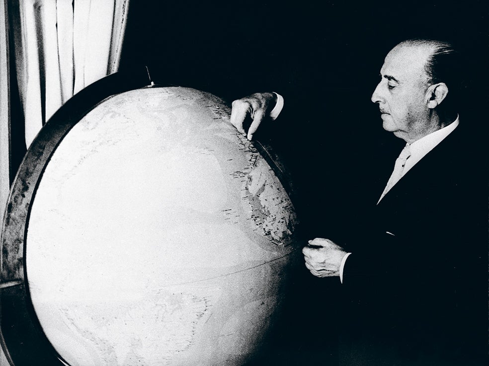 Francisco Franco, a quienes sus acólitos llegaban a calificar como ‘el centinela de Occidente’, le toma la medida al mundo con un metro de sastre en una foto hecha en su despacho en 1953.