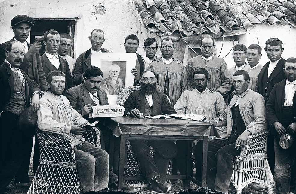 Los miembros de Partido Socialista de Villagordo del Júcar (Albacete) posan tras la creación de la agrupación local. Era el año 1925, el mismo en que murió Pablo Iglesias, retratado en la fotografía que sostienen dos de las personas que posan de pie.
