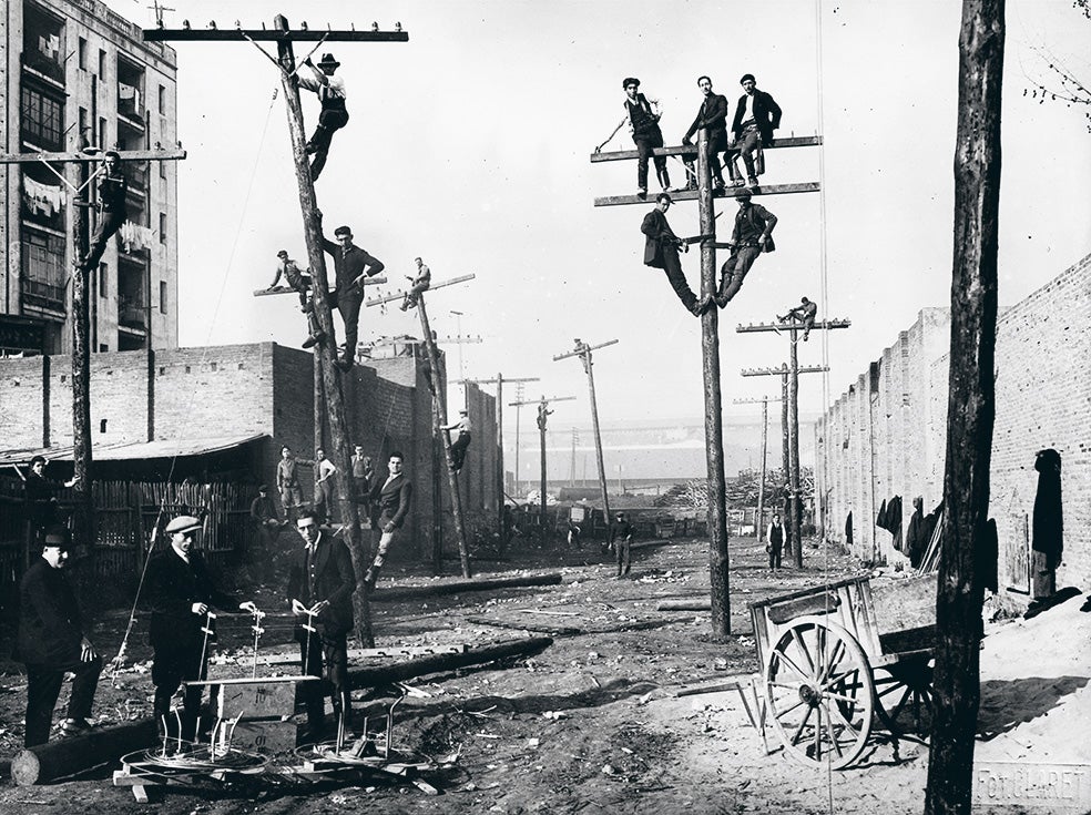 La instalación de postes telefónicos por todo el país en los años 20 se convirtió en la imagen más representativa del progreso, como este tendido de cables en la provincia de Barcelona.