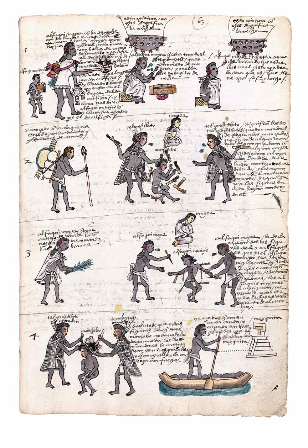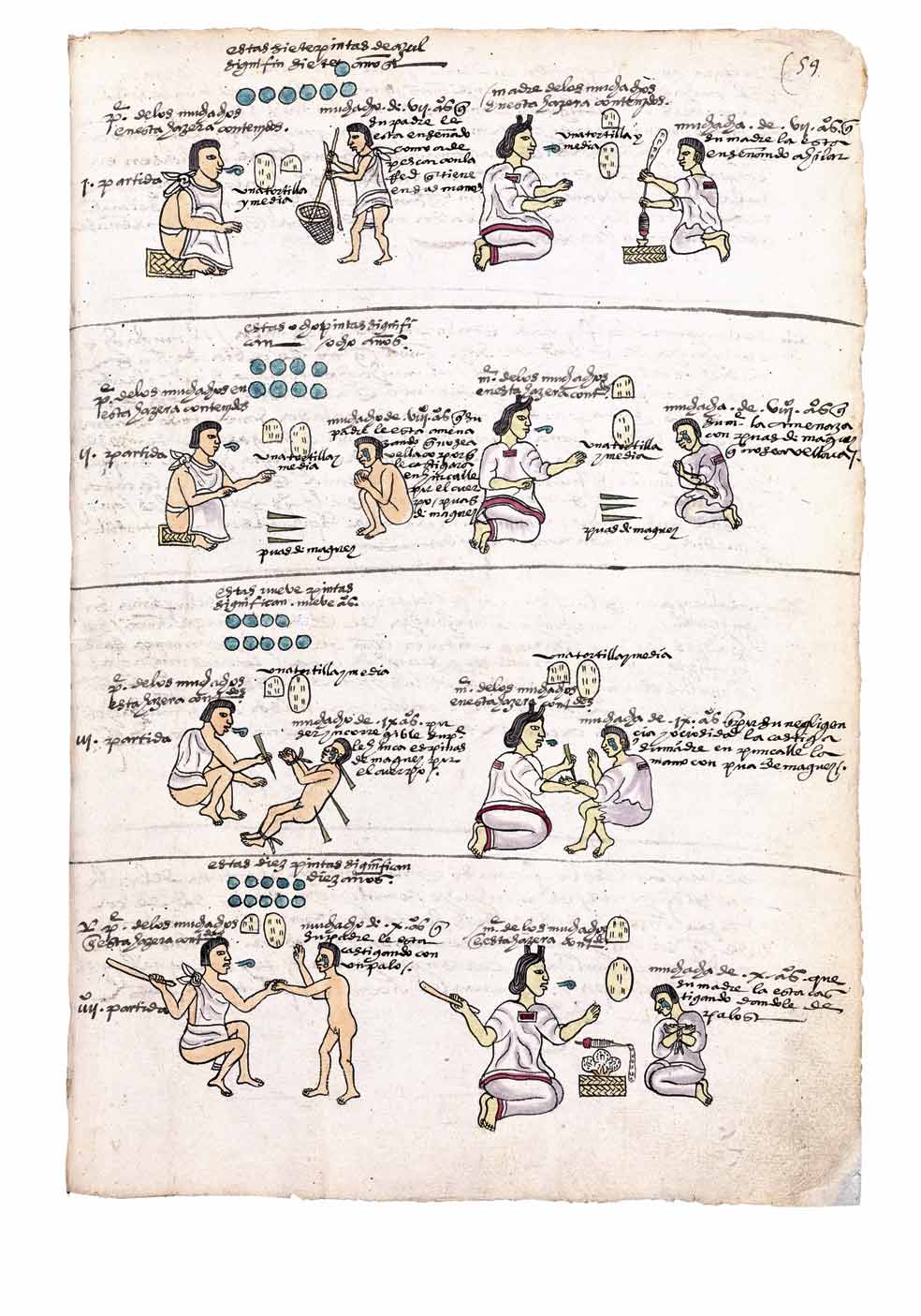 A partir de los ocho años, a los niños desobedientes se les podían clavar espinas de maguey, golpearlos con una vara o hacerles aspirar el humo de chiles asados... Nótese el glifo de la admonición y la lágrima en la cara del niño.