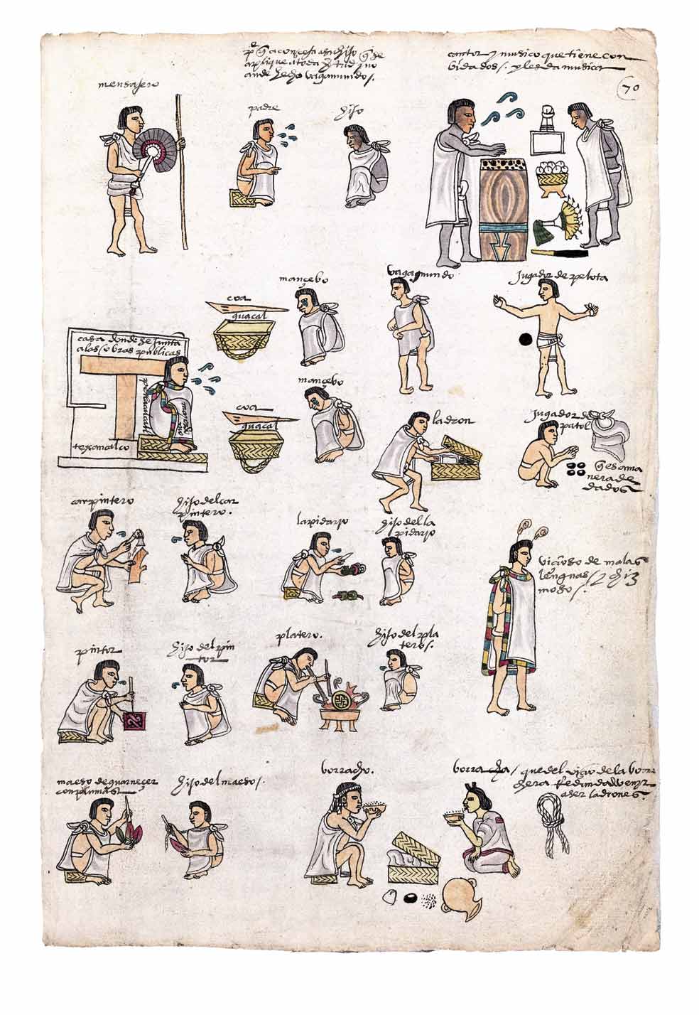Los padres aconsejaban a sus hijos que fueran virtuosos y obedientes. La holgazanería era castigada. Y acabar siendo un vagabundo o un borracho era caer en lo más bajo. Se transmitían de padres a hijos algunos oficios, como el de platero y el de pintor o tlacuilo, que debía saber de muchas materias, pues los dibujos ilustraban lecciones y representaciones teatrales sobre la historia y las costumbres.