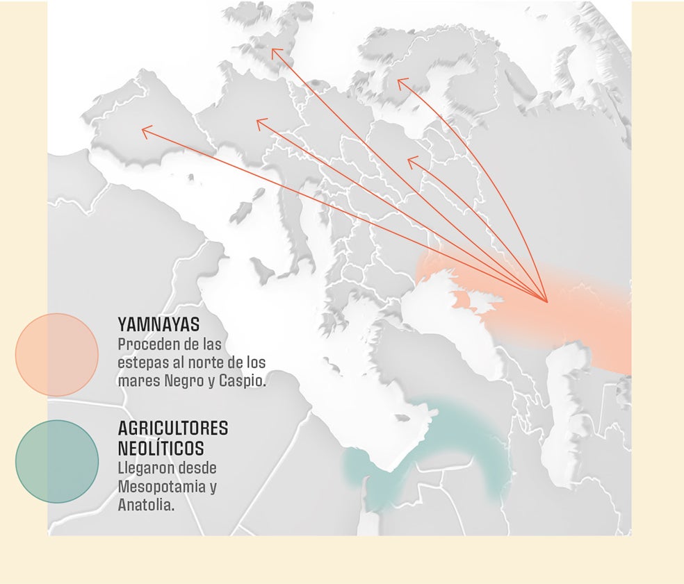 Pero no hay duda de que dejaron su huella genética aquí. «Desplazaron a los hombres locales casi por completo», asevera el genetista estadounidense David Reich. Además, los yamnayas fueron determinantes también en la lengua. Hay pruebas realizadas con ADN antiguo que demuestran su ligazón con el protoindoeuropeo. «Todas las áreas geográficas que a finales de la Edad de Bronce y durante la Edad de Hierro hablaban lenguas indoeuropeas –desde el sur de Siberia, la India y casi toda Europa– tienen ascendencia yamnaya», dice Íñigo Olalde.