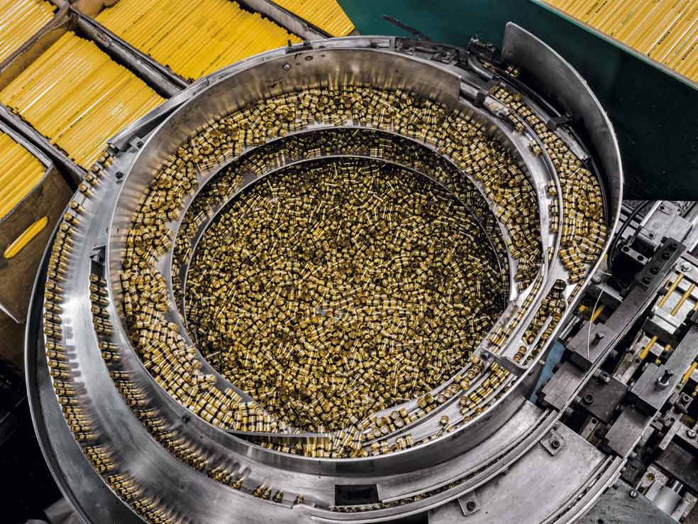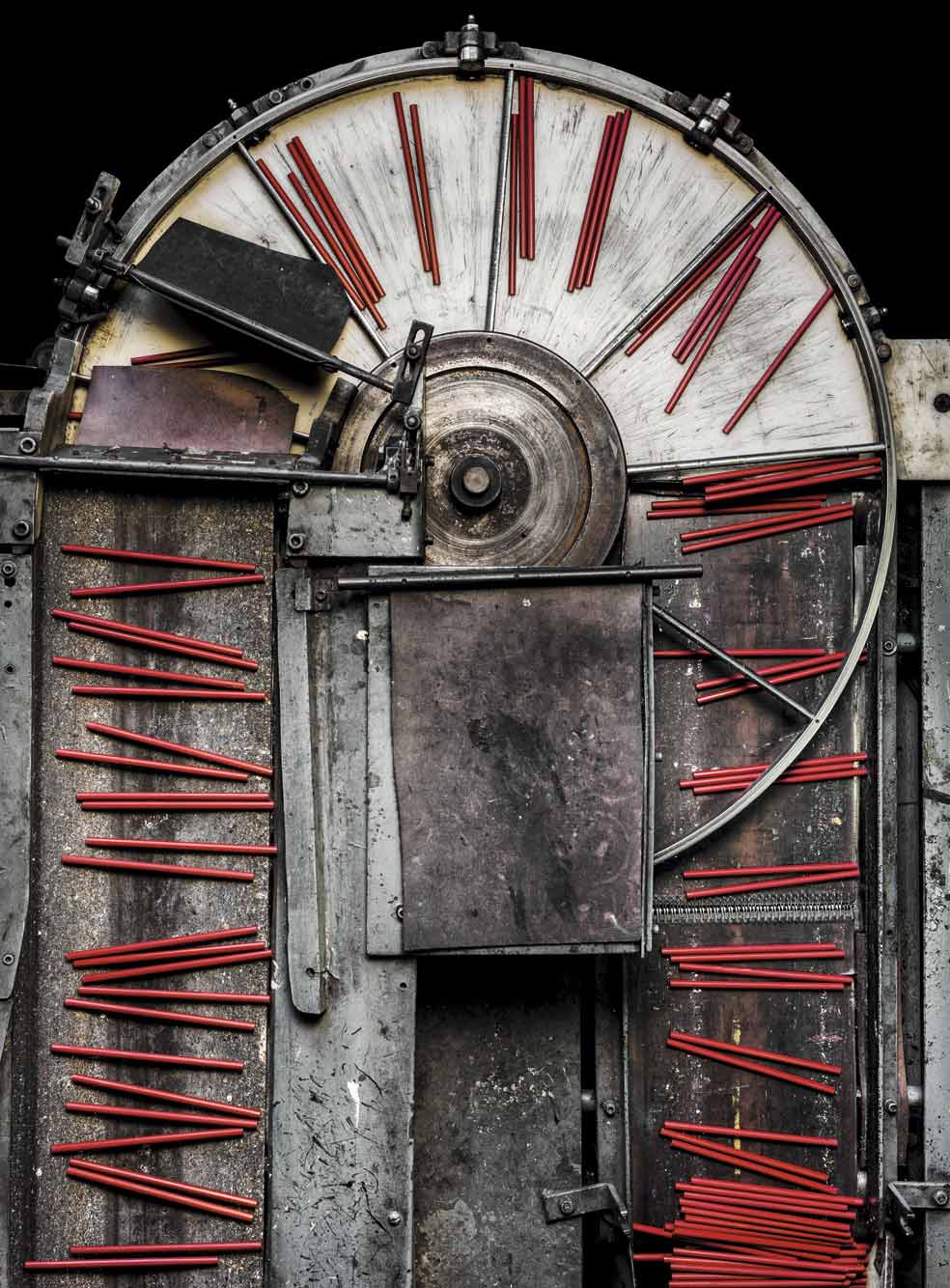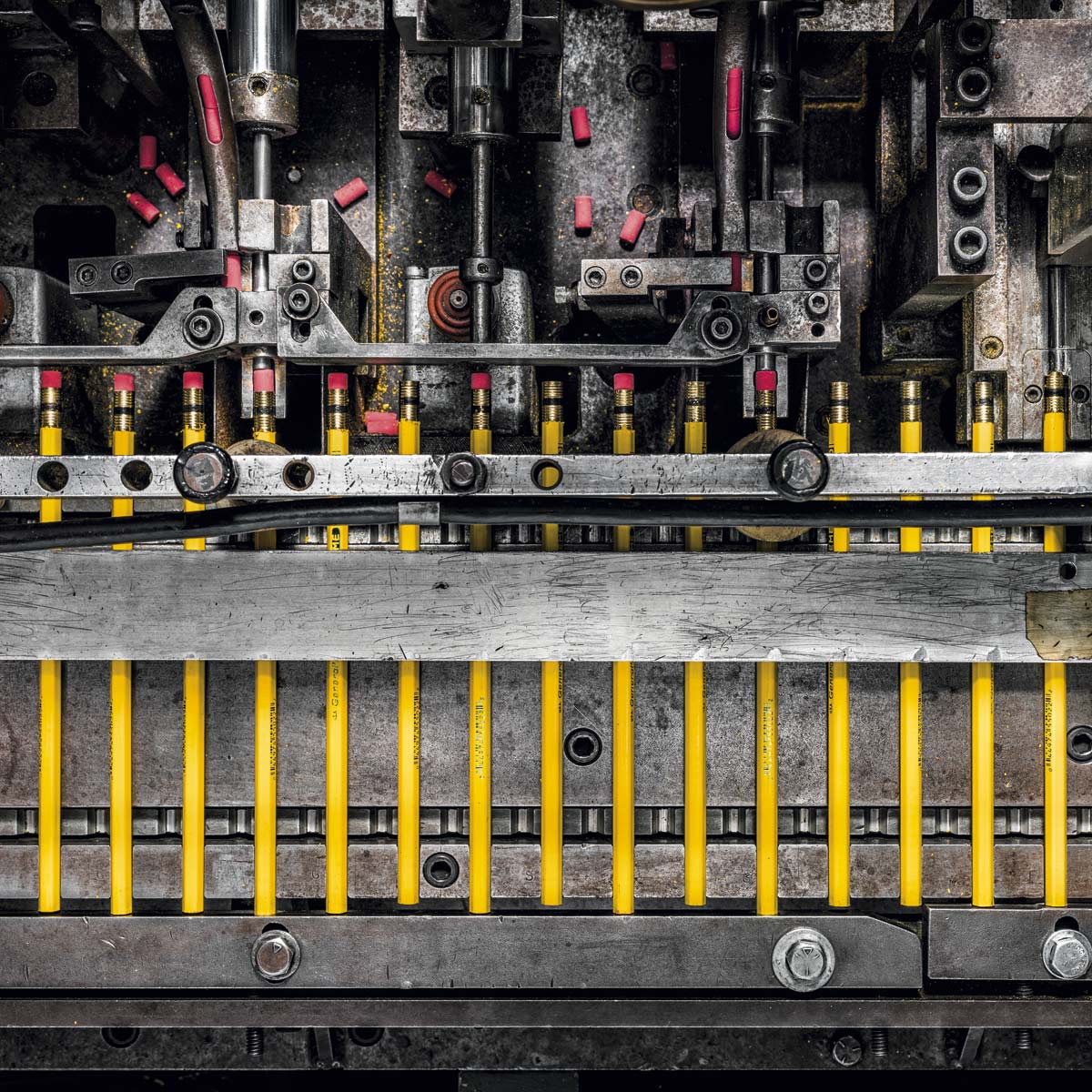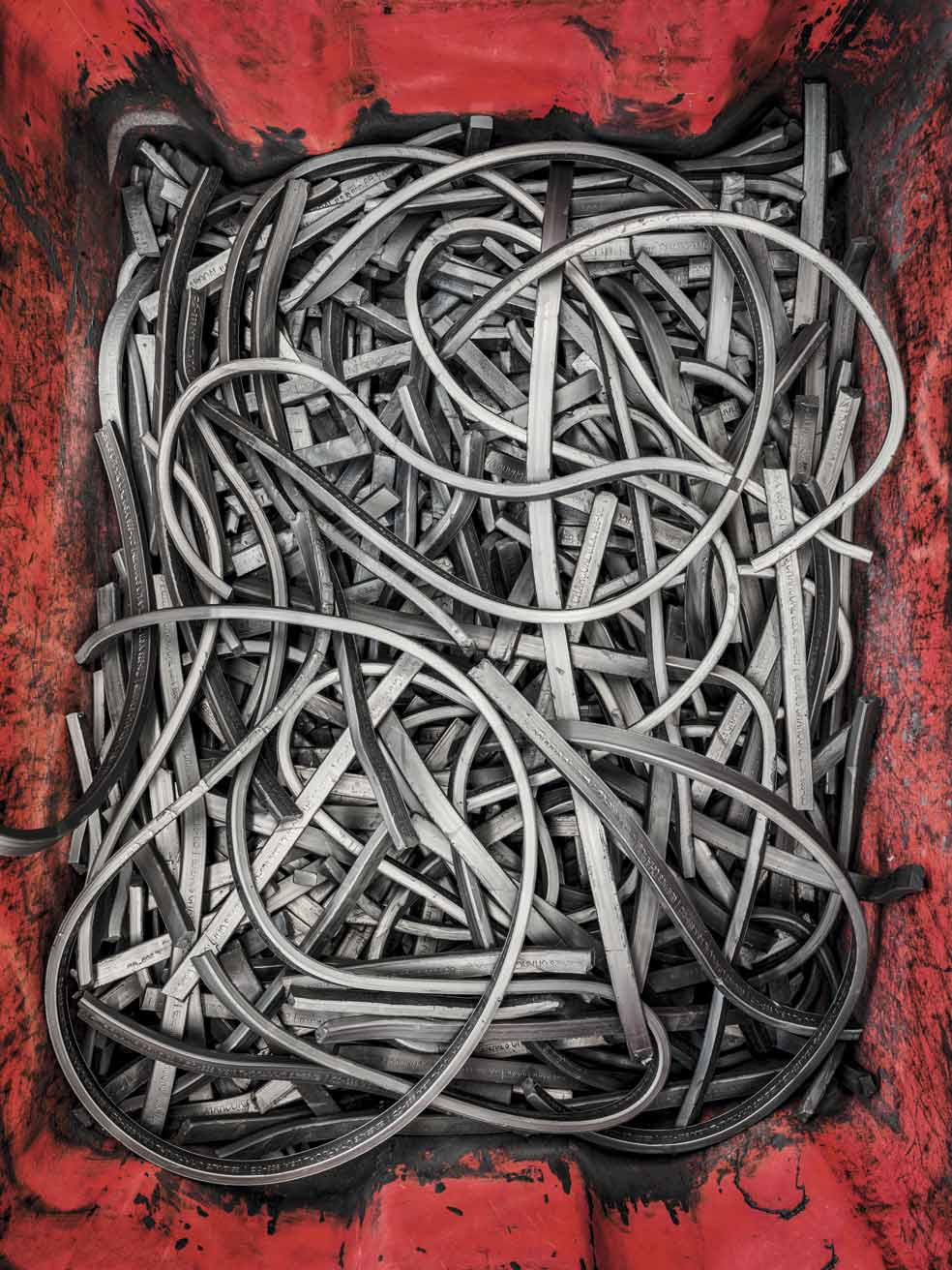 Las virolas -la banda de metal que sostiene las gomas- en un contenedor que las traslada a la máquina de ensamblaje. El fotógrafo nos permite ver que algo tan simple como un lápiz se descompone en piezas aun más sencillas. Es «la magia estética de la escala».
