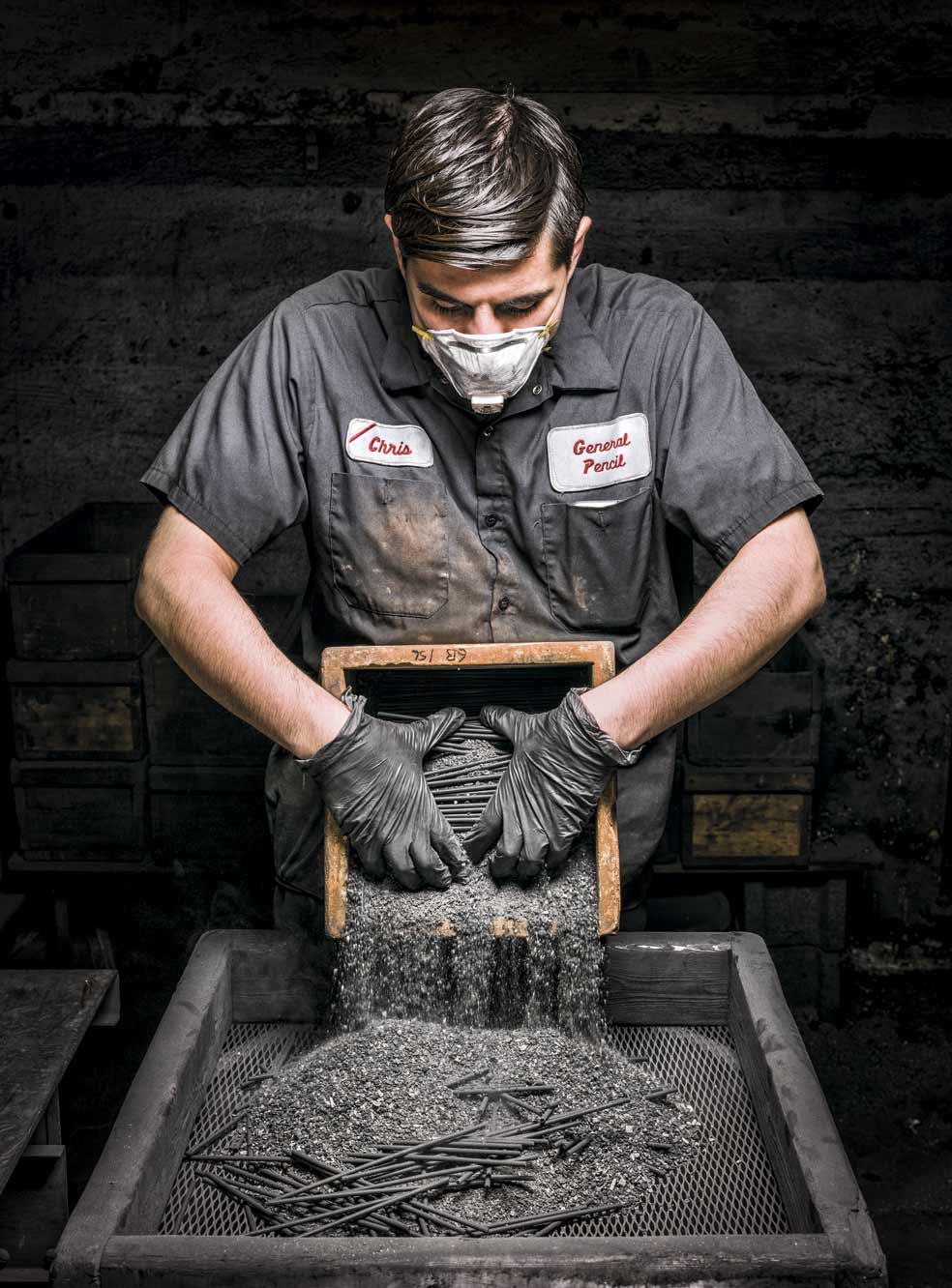 La mina es una mezcla de grafito fino y arcilla que se cuece en hornos. Los 'corazones' de los lapiceros emergen de las máquinas como pasta fresca, lista para ser cortada en diferentes largos. Luego se seca y se coloca dentro de sus caparazones de madera de cedro. Los de algunas pinturas son muy frágiles y se ponen a mano.