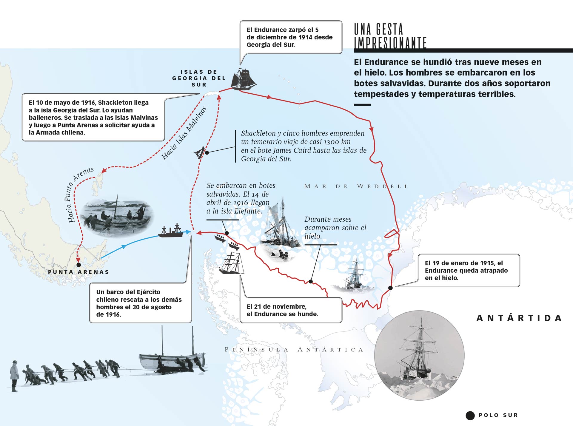 Shackleton, de 40 años, quería ser el primero en atravesar el continente blanco, pero la vida le tenía reservado otro destino. La expedición de este ... oficial británico y sus 27 compañeros concluyó en el mar de Weddell, una región especialmente hostil situada justo a las puertas de la Antártida.