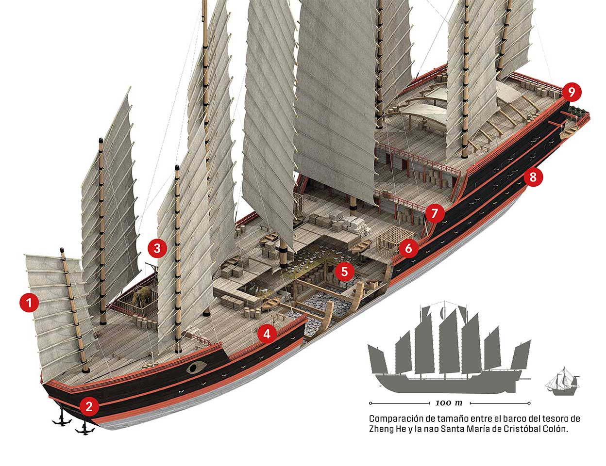 No queda resto de los barcos de Zheng He, pero se sabe cómo eran por la descripción de los constructores y los testimonios de viajeros como Marco Polo o Ibn Battuta. Uno de los elementos imprescindibles eran las grúas, que utilizaban para cargar y descargar el barco.