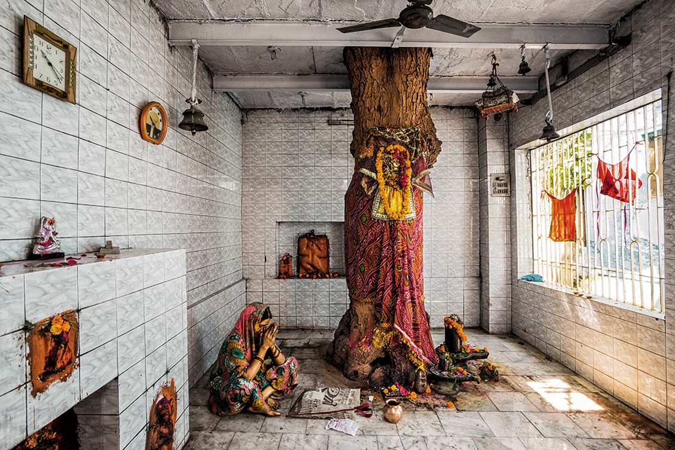 El niño nació prematuro y, además, estaba muy enfermo. Iba a morir. Su padre acudió al templo dedicado a la diosa Shitala (en la imagen) erigido en torno a un neem o nimbo de la India (Azadirachta indica es su nombre científico). Las hojas de este árbol se usaban en la India para tratar la viruela y para bajar la fiebre. El niño se salvó. Su padre es ahora el cuidador del templo y del árbol.