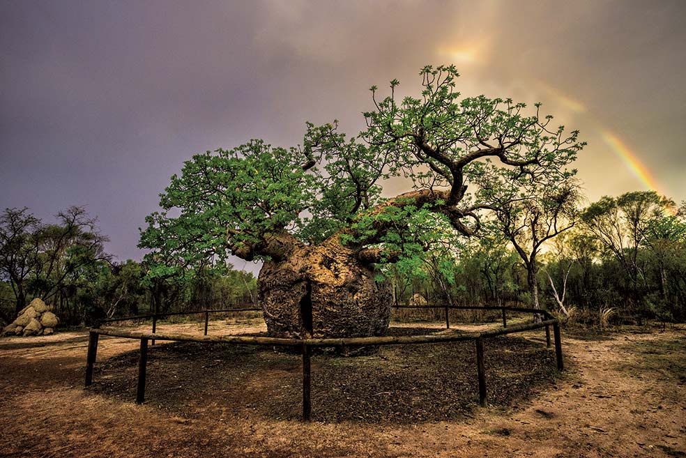 El baobab viajero El boab (Adansonia gregorii), un pariente de los baobabs de África, podría haber llegado a Australia con los movimientos de población hace 70.000 años. Hoy es venerado por los aborígenes australianos y también es fuente de agua: su madera esponjosa puede almacenar 100.000 litros de agua. El de la foto, de unos 1500 años de edad, fue usado como osario por los aborígenes.