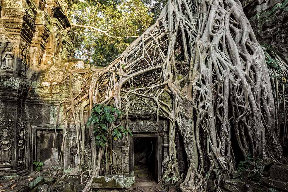 Cuando los arqueólogos franceses empezaron a desnudar de naturaleza los templos abandonados de Angkor que hallaron en las selvas camboyanas en 1907, decidieron detener sus machetes en el templo de Ta Prohm y preservar su aspecto, devorado por raíces. Y así sigue. En la foto, un higo estrangulador (Ficus gibbosa) hace honor a su nombre.