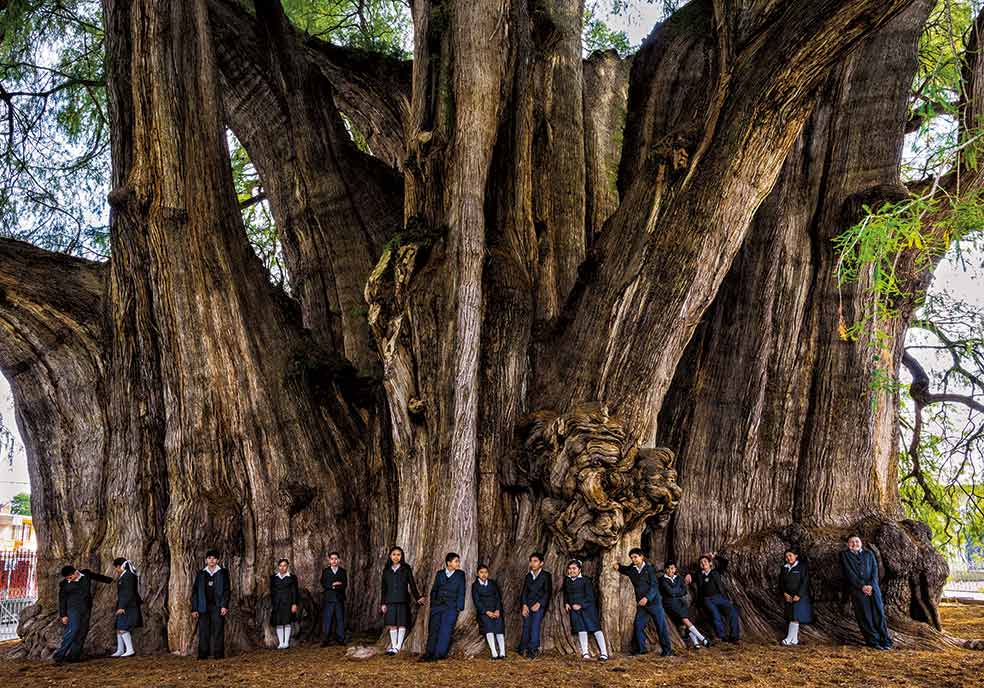 El llamado ciprés de Montezuma (Taxodium mucronatum) es conocido en la lengua náhuatl, como ahuehuete, que significa ‘el viejo en el agua’. Un nombre apropiado. Santa María de Tule (Oaxaca, México), donde se encuentra, era una zona pantanosa cuando nació este imponente ejemplar, hace al menos 1200 años que, según algunos, podrían ser hasta 3000. Su tronco, con una circunferencia de 42 metros, es el más grande del mundo. Venerado por los zapotecas desde época precolombina, se encuentra hoy en el atrio de una iglesia católica del siglo XVIII. La cercana autopista Panamericana amenazaba su super-vivencia hasta que en los noventa el Gobierno desvió el tráfico para protegerlo de la contaminación.