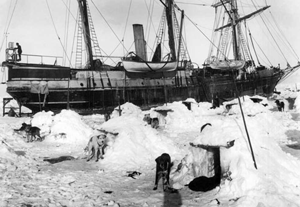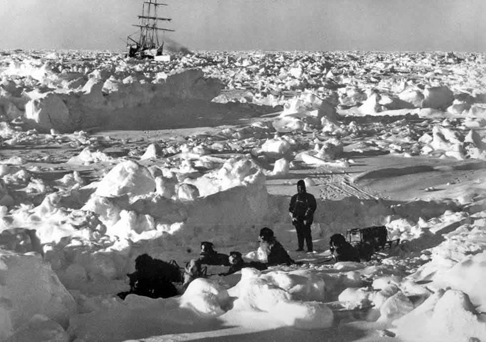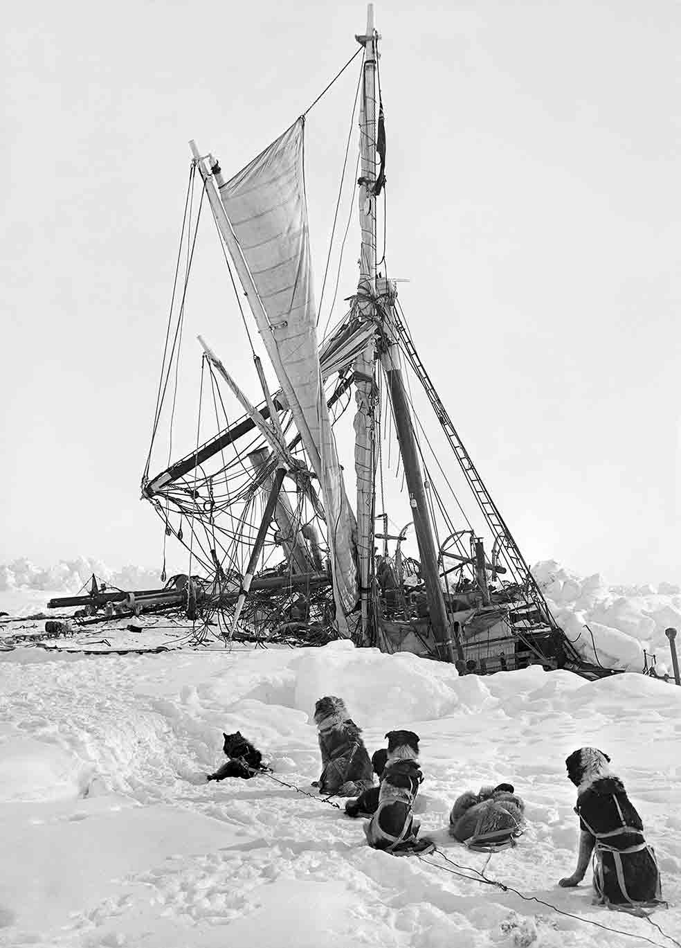 En el Endurance había marineros, mecánicos, biólogos, un meteorólogo, un bombero y un fotógrafo, Frank Hurley, el autor de todas estas fotos. Se trataba de ... estar preparado para una expedición científica y todas sus posibles eventualidades. Entre los perros también había un poco de todo —terranovas, san bernardos, esquimales, perros lobos y lobos—, pero todos preparados para sobrevivir a temperaturas muy por debajo del cero. Llegaron 99 candidatos desde Canadá. Subieron a bordo 69 perros. Shackleton compró el Endurance por unas once mil libras, un precio barato para la época. Fue construido para cruceros turísticos, aunque se adaptó para romper el hielo y se cargó con equipo para condiciones extremas. Lo primero, los trineos y los perros. Pero Shackleton no calculó bien la dureza del hielo al que tendrían que hacer frente.