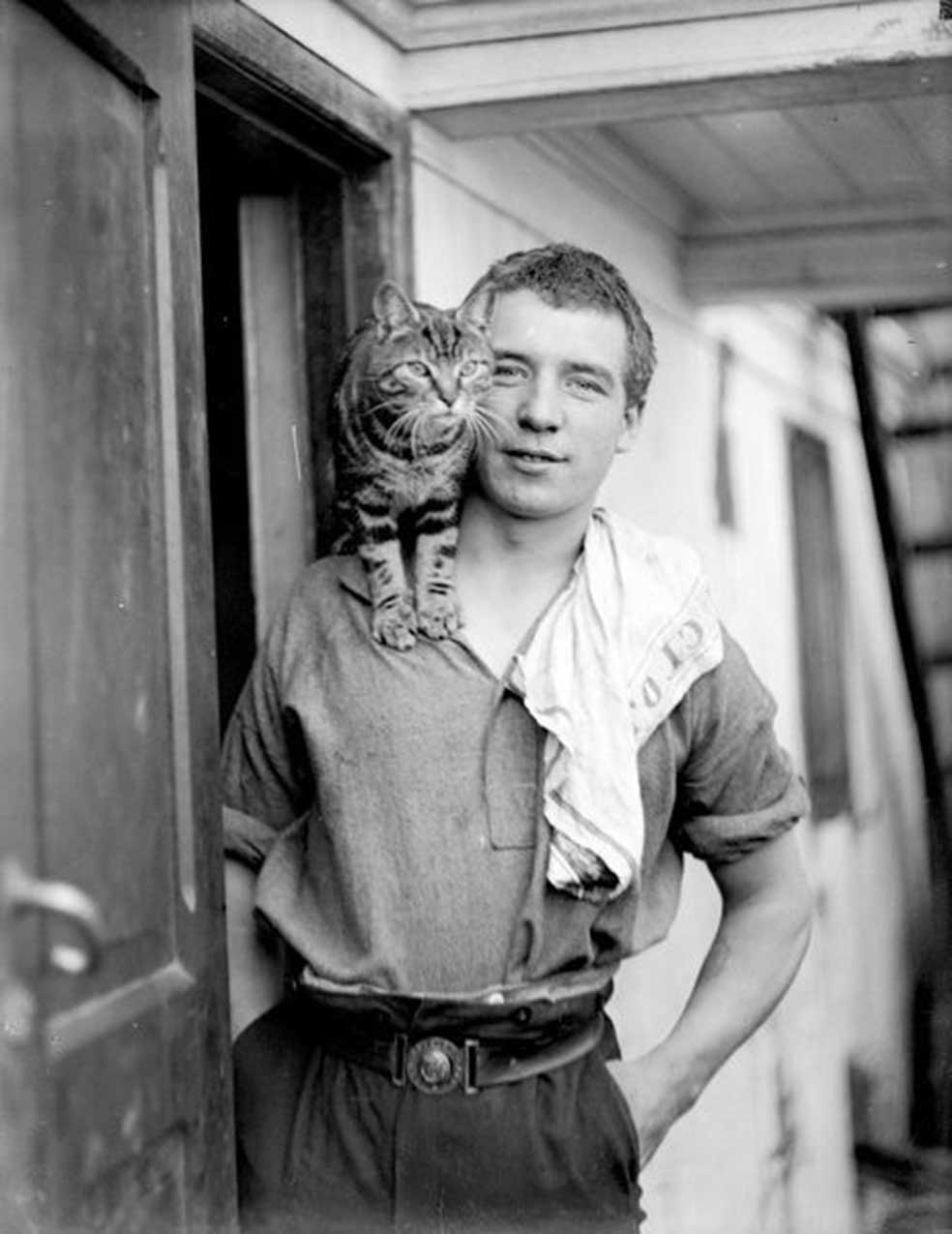 Lo llamaron Mrs. Chippy, la señora Chippy, porque creían que era una gata. Cuando resultó ser un gato ya era tarde para cambiarle el nombre. El felino subió a bordo con el carpintero del barco, Harry McNish, (apodado Chippy, de ahí el nombre de la gata), pero hizo pronto amistad con el polizón, un chico de diecinueve años, Percy Blackborrow, con quien posa en esta foto. El gato maravillaba a los tripulantes por sus paseos por la barandilla del buque incluso cuando el mar estaba agitado. Mrs. Chippy fue sacrificado con los perros jóvenes, para indignación del carpintero que llegó a enfrentarse a Shackelton. Aquella insubordinación le privaría de recibir la medalla Polar que recibieron el resto de sus compañeros. Sobre la tumba del carpintero hay una escultura del gato.