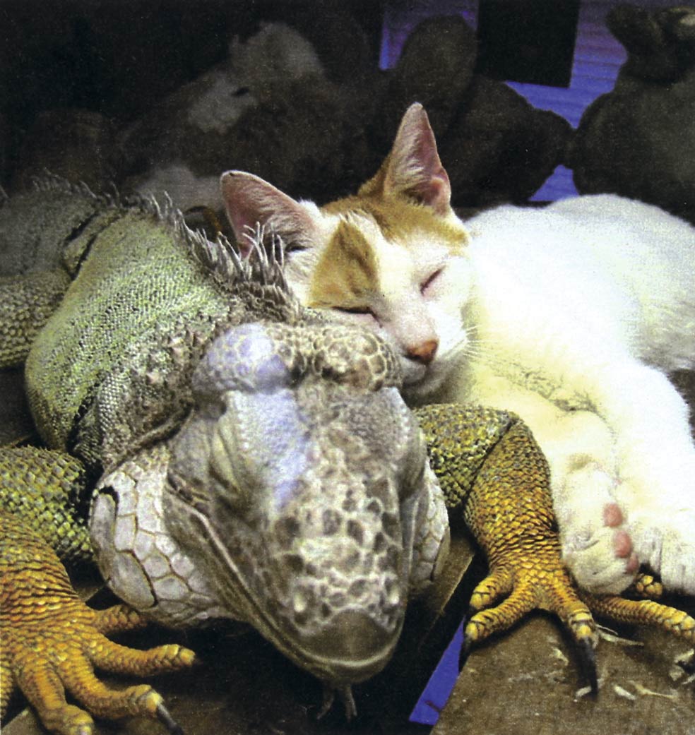 La iguana Sobe y el gato Jo fueron recogidos de las calles de Nueva York, y una cuidadora de animales se hizo cargo de ambos. La primera vez que el gato se le acercó, la iguana se hinchó y empezó a sisear. Jo no se dejó impresionar y se recostó sobre ella… Así rompió el hielo.