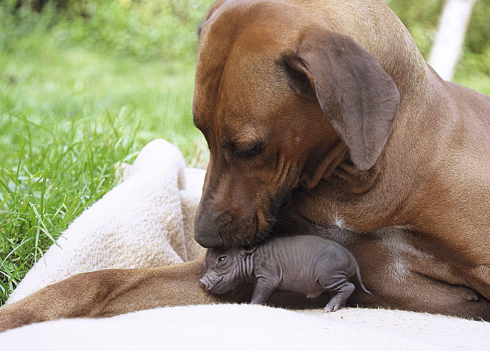 Paulinchen, la cría de cerdo vietnamita, fue rechazada por su madre. Roland Adam, el dueño, se la confió a su perra, que acababa de traer al mundo a su camada. Katjinga, la perra, cuidó de la cría hasta que esta recobró las fuerzas.