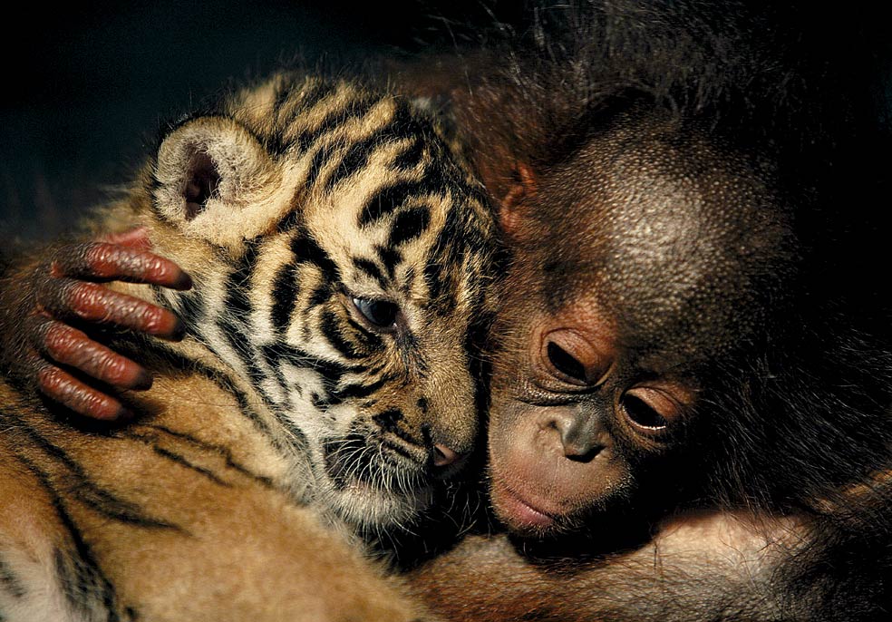 El zoo de Cisarua (Indonesia) tuvo que criar al mismo tiempo a dos cachorros de orangután y tigre, repudiados por sus madres. Los animales empezaron a jugar y dormir juntos. A los cinco meses fueron separados, pues los tigres cada vez se mostraban más agresivos.