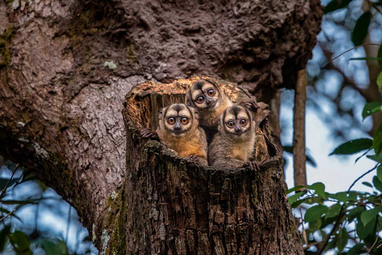 La imagen —ganadora del Gran Premio de América Latina— tiene algo de la ambigüedad infinita de La Gioconda. Así como en la obra de Da Vinci no es posible saber si la retratada está triste o sonríe irónica —o ambas cosas a la vez—, en esta toma de Gustavo Garcés Villa resulta difícil determinar si estos tres monos de noche son entrañables y encantadores o temibles psicópatas capaces de mutar en aterradores gremlins. El fotógrafo los retrató en un bosque de Villavicencio, Colombia, a punto de irse a dormir en el interior de un tronco, tras otra larga noche de aullidos e intensa marcha...