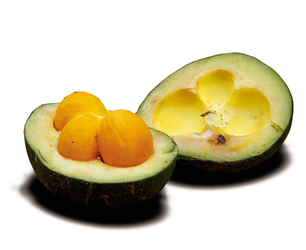 O ‘cupuazu’, está emparentado con el cacao y muy extendido en Colombia, Perú, Brasil y Bolivia. De gran tamaño -puede llegar a pesar dos kilogramos-, la pulpa tiene un sabor entre chocolate y piña. Se usa como postre o zumo.