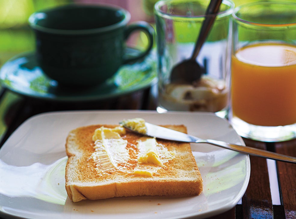 «Tomo unas tostadas con abundante mantequilla, un café con leche y un zumo de naranja recién exprimido de la tierra donde estoy viviendo (Valencia)».